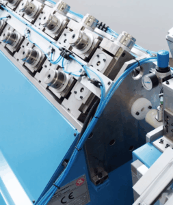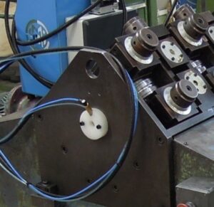 In the rolling mill with a variable roll rotational speed, there is the possibility to program the rotation speed for each pair of rolls through frequency inverters, depending on the elongation of the elements. This solution allows to set the machine for different tube materials. Five sets of program scales of roll speed are available. Each pair of rolls will have a speed corresponding to the elongation of the tube, depending on the tube material. Having control of the speed of each roll station, it is possible to match as closely as possible the elongation occurring. This means that there is less friction between the rolls and tube, and therefore less heat generated by friction. As a result, the rolls last longer and the elements exit straighter.