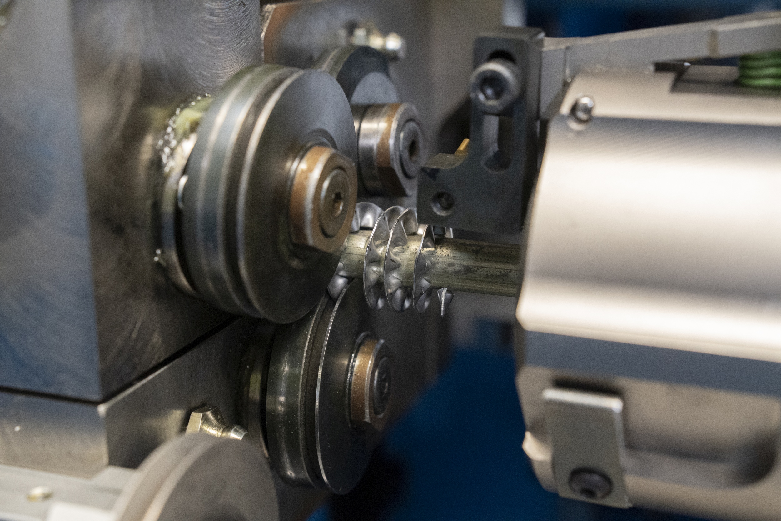 L’elemento viene spinto avanti finché si arresta sul fermo del mandrino rotante del carro di alettatura.