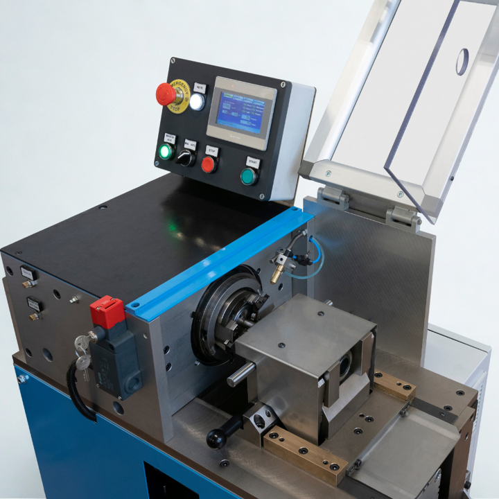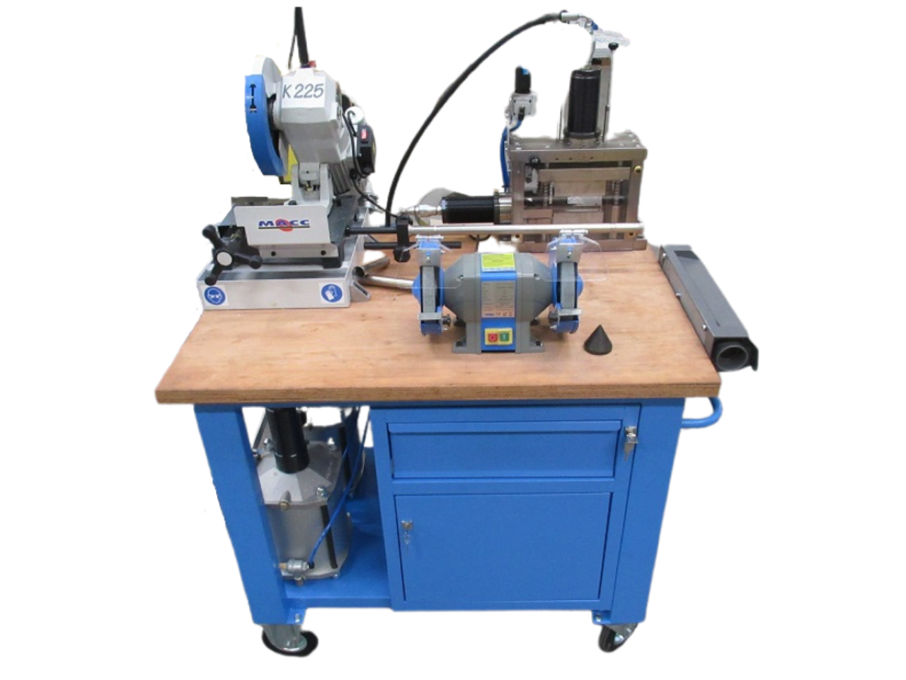 Unità di collaudo per test della qualità della saldatura dei tubi in acciaio inossidabile, completa per un diametro di tubo, con: banco di supporto, completo di cassetti, pressa idraulica olio-aria, completa di punzone per allargare la sezione del tubo (60°), morsa per il bloccaggio del campione di tubo e regolatore di pressione, sega circolare per il taglio a lunghezza del campione da testare, unità per la sbavatura interna/esterna del tubo.