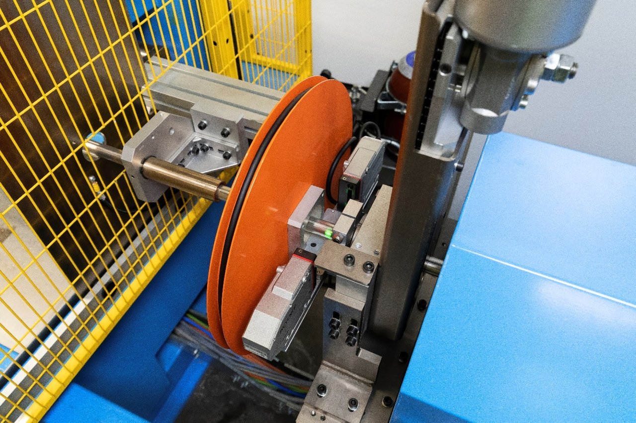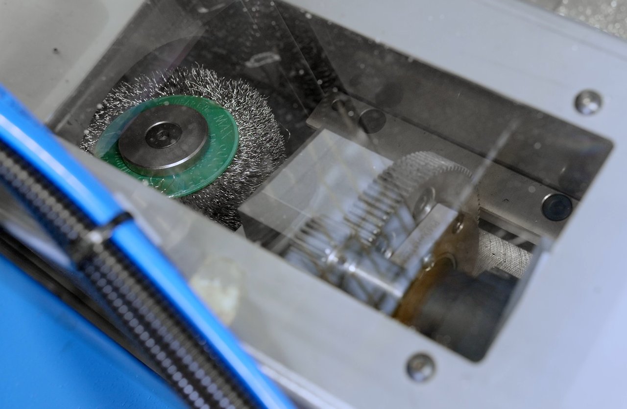Unità per sbavatura delle estremità del tubo tagliato tramite spazzolatura. Un insieme di spazzole rotanti rimuove le piccole bave dovute al taglio a lama rotante, favorendo un taglio squadrato alle estremità del tubo, senza sbavature.