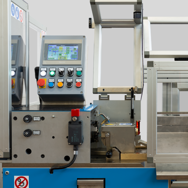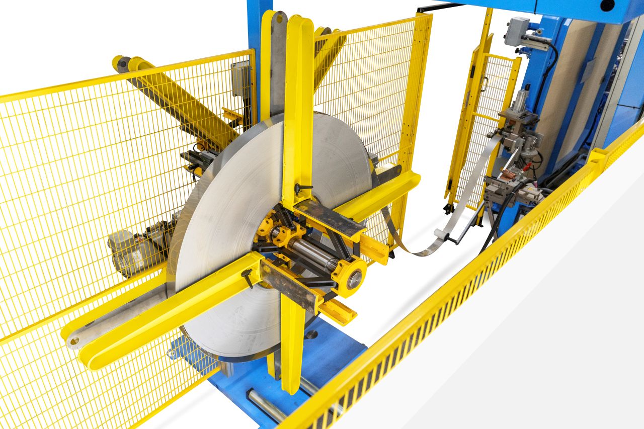 DOPPIO ASPO SVOLGITORE con la possibilità di contenere 2 bobine di nastro in acciaio inossidabile, che evita di fermare la macchina durante la sostituzione della bobina, minimizzando i tempi inattivi.