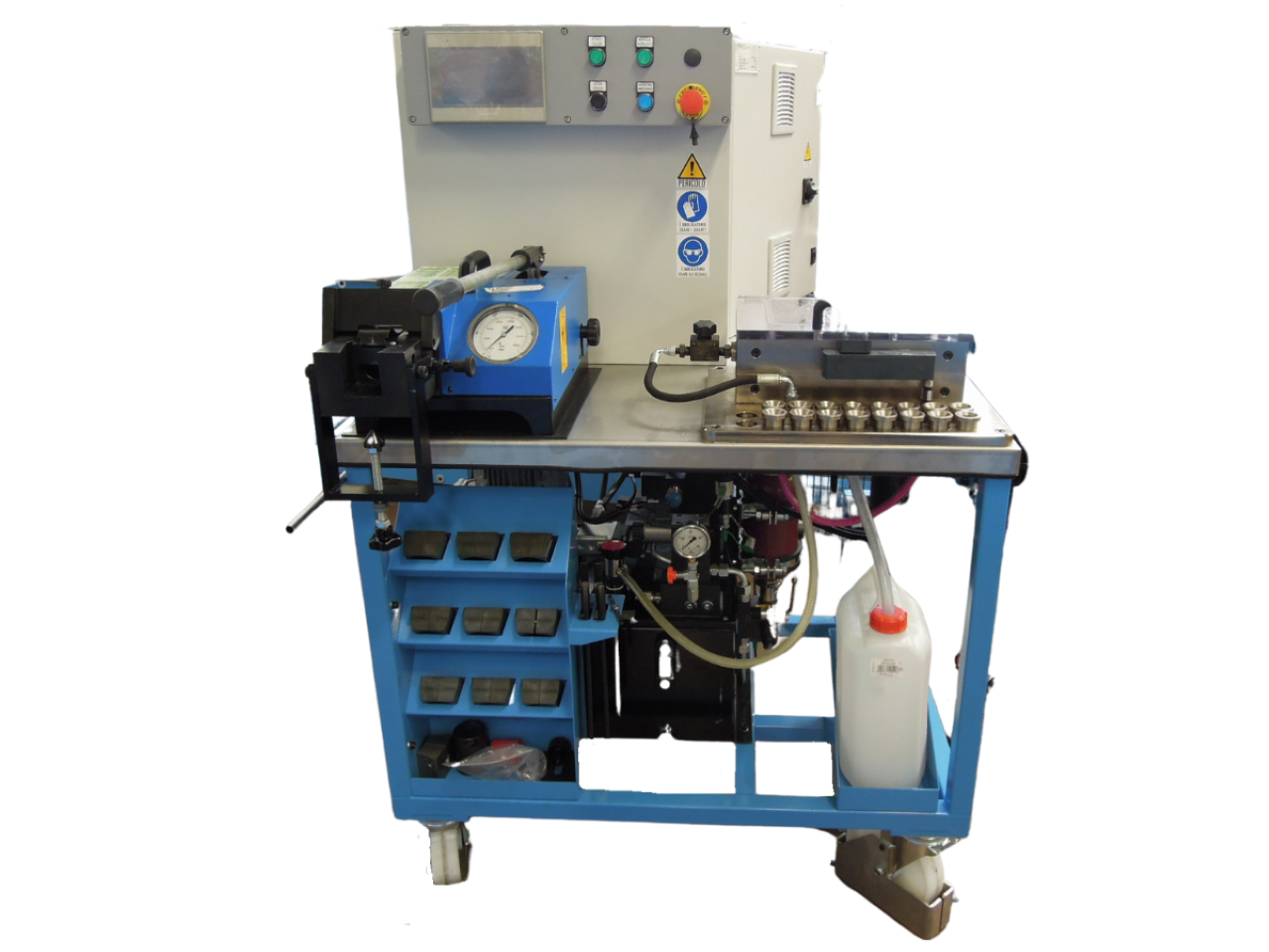 Unità di test della sezione del tubo mediante deformazione con mezzi idraulici, completa di: banco di supporto, supporto matrici di taglio, matrice per deformazione del tubo, unità di connessione matrice e sezione del tubo, unità di alimentazione idraulica con gruppo ad alta pressione (1000 bar), con regolazione proporzionale. La macchina è predisposta per un diametro/spessore.