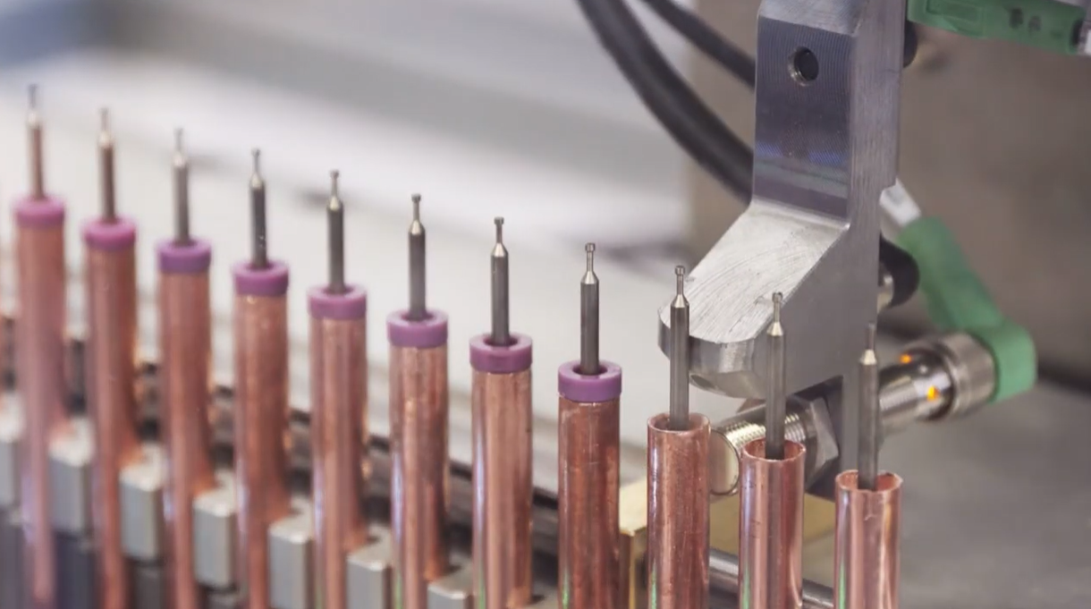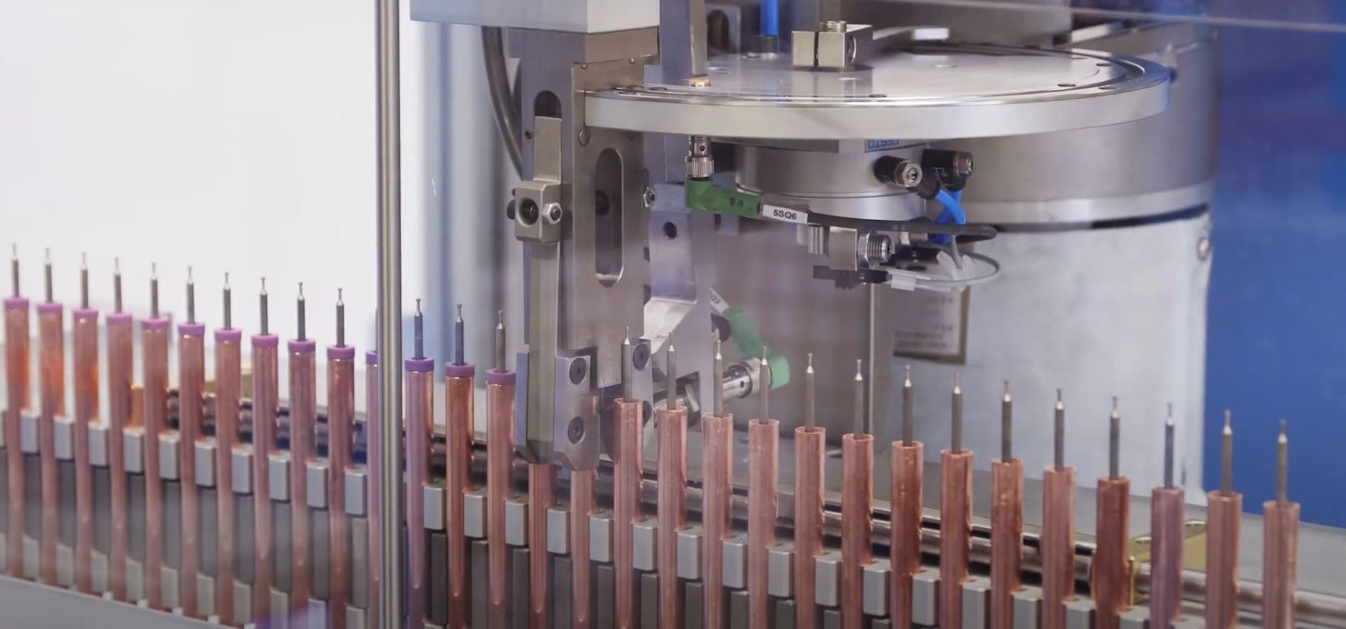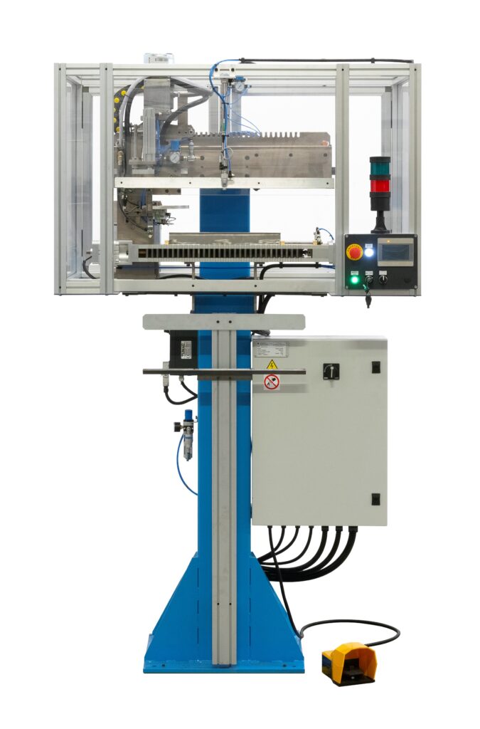 Una volta che l’operatore ha caricato le resistenze elettriche riempite nella macchina, la montatappi superiore comincia a lavorare in autonomia.