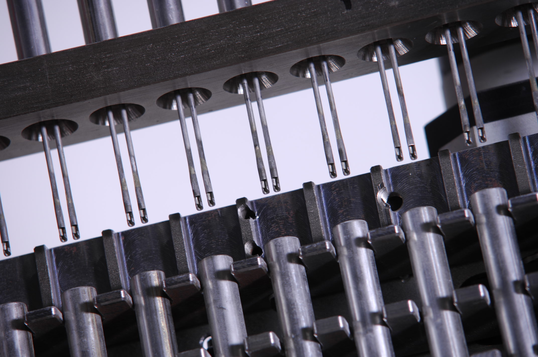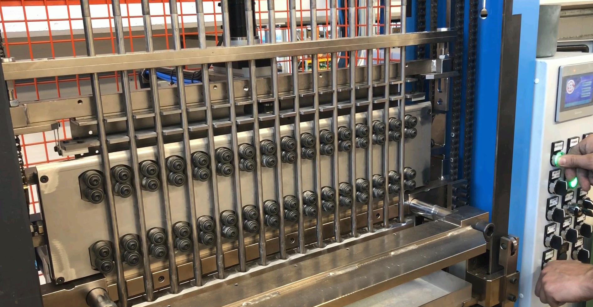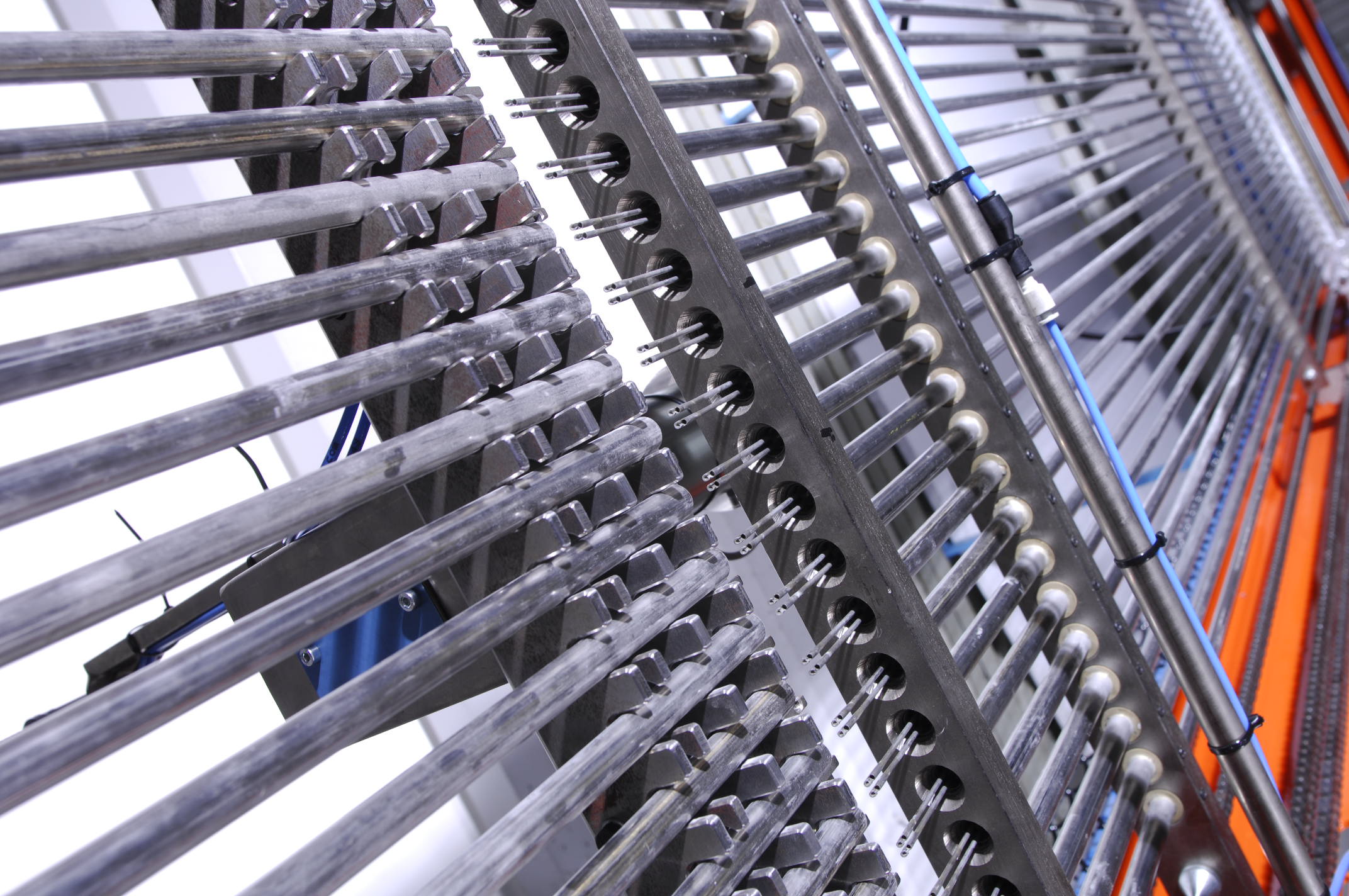 grazie ad un encoder che controlla la posizione del gruppo vibratore evitando la collisione dei perni con la barra inferiore.