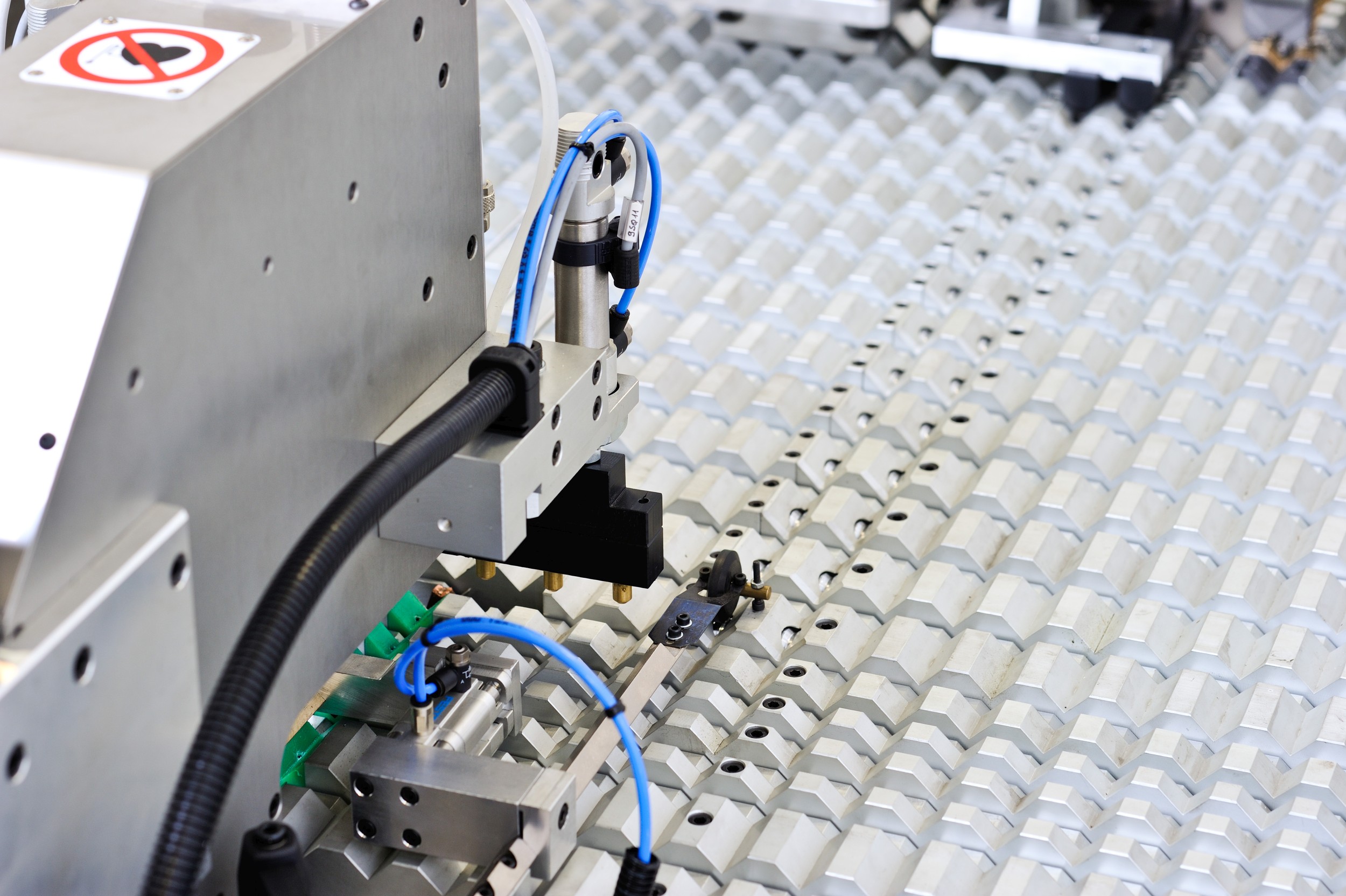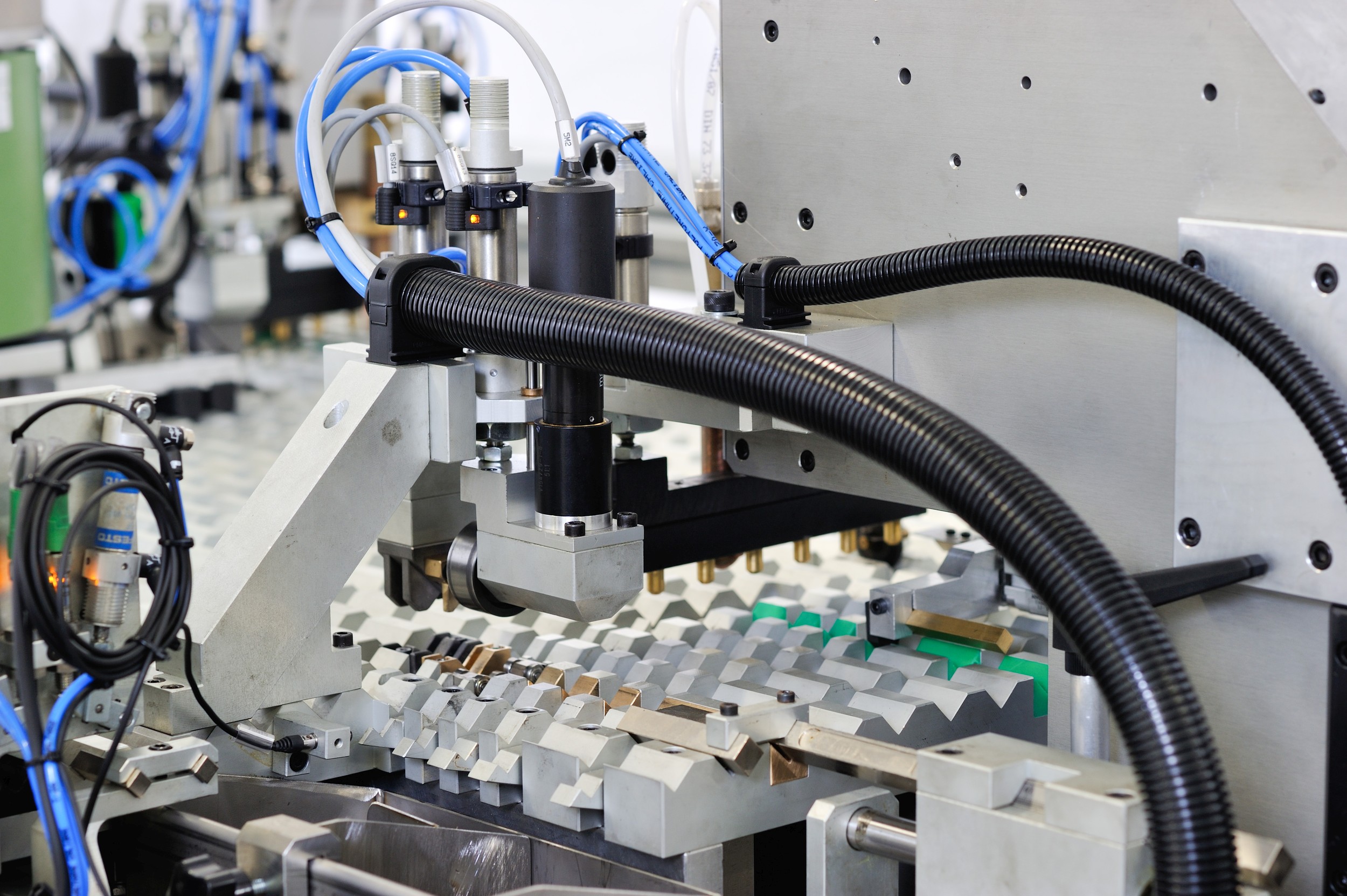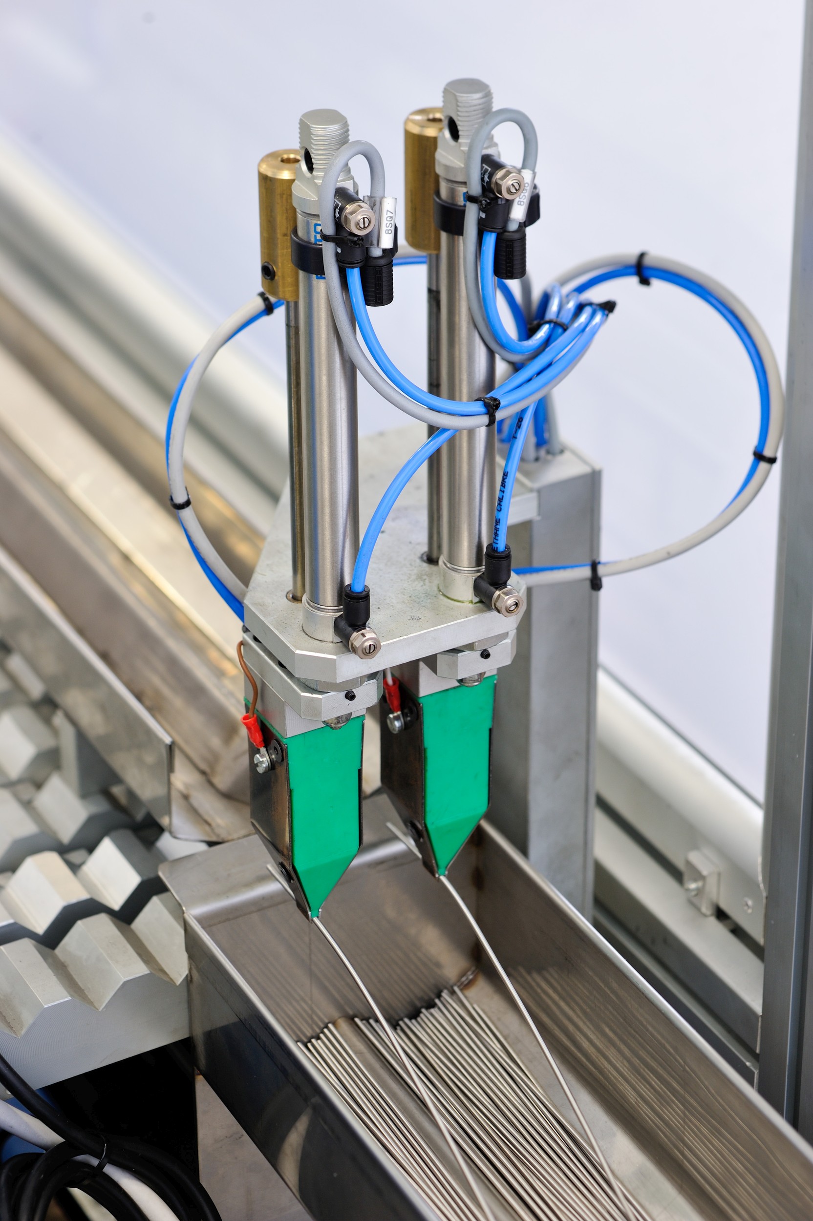 Un unico macchinario in grado di eseguire tre operazioni contemporaneamente: assemblare i perni terminali alla spirale, montare il tappo di plastica sul perno terminale inferiore e saldare la spirale ai perni terminali.