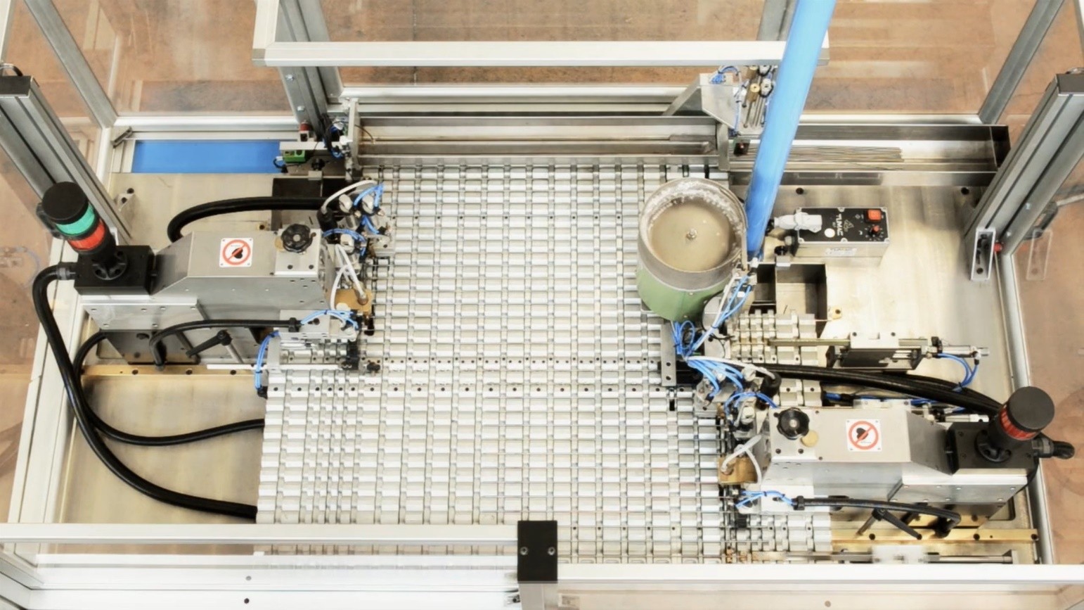 I perni terminali vengono posizionati a pacchi, con le punte orientate tutte nella stessa direzione, nelle tramogge alimentatrici. Ad ogni ciclo della macchina viene alimentato un perno e controllata la presenza sul transfer, tramite sensori ottici.